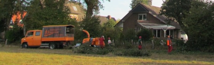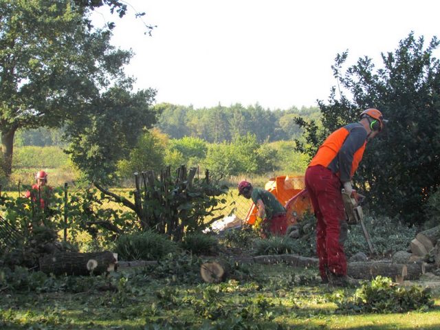 Schreddern des Astwerkes, Zerlegen des Stammholzes, Abfuhr und fachgerechte Entsorgung, gründliche Aufräumarbeiten.